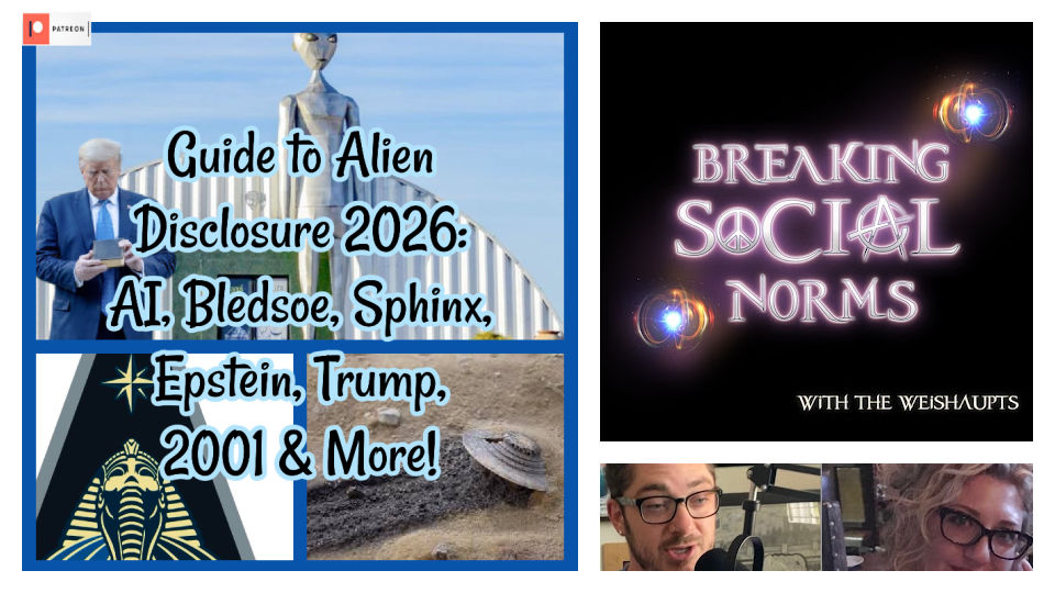 Listen to “Guide to Alien Disclosure 2026: AI, Bledsoe, Sphinx, Epstein, Trump, 2001 & More!” on Spreaker.Welcome back! You’re listening to the “Breaking Social Norms” podcast with the Weishaupts! Today we’re preparing you for what’s about to happen with the impending alien disclosure. From Obama to Trump Alien Files, Project Blue Beam to Aleister Crowley and Sphinx rituals, to Chris Bledsoe’s predictions and AI aliens, as well as Epstein files and cannibalism; Pete Hegseth’s 315 bench, and finally we’re revealing the occult meaning behind all of this going back to Kubrick’s 2001: A Space Odyssey and beyond!